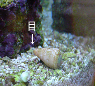 ヤドカリ君がコケ掃除してくれないのでマガキガイという貝を2匹入れました。この貝ちょっと不気味な顔なの。目玉がカタツムリのように出てるのだけど、両目の長さが違うので怖い。そして黒くて大きな舌(じゃないよね)でベロベロ〜っとコケを食べてくれるんです。頑張ってください。