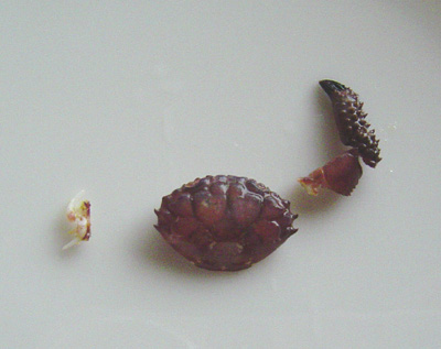 ライブロックの下の方に1センチくらいの貝らしきものが・・。でもなんだかおかしいのでお箸で拾い上げてみるとなんと蟹!(笑) 片方のハサミもある。なんで蟹おるねん(笑)ほんで誰が食うてん(笑)。 あとで分かった事。 カニは脱皮するんだそうで、これはただの抜け殻です。 ・・・ってことは水槽内に大きくなったカニが潜んでいるって事です(^_^;) カニは魚を食べたりするので見つけ次第取り出さなくてはけません。でもなかなかつかまらないそうだ・・。