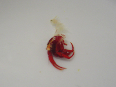 3月1日 なにげなくヤドカリの様子を見ようとした時、とんでもない事が!なんと貝から体が飛び出し、しかも胴体がちぎれたように白くなっている・・・。目玉はショボンとしてぴくりとも動かない。 あああ死んでしまったのだ。ここんところずっとライブロックの窪みに入ったまま出ようとしないなと思っていたのだが。 しかたなくピンセットで取り上げて水槽から出した。 貝はそのまま水槽に残すことにした。 |