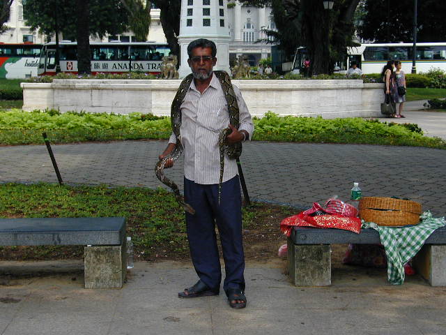 公園内にいる、観光客目当てのヘビ使いのおじさん。